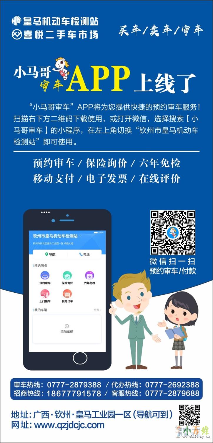 车主朋友们,请登录【小马哥审车】小程序进行预约,到钦州市皇马机动车检测站审车www.xbaixing.com小百姓网。